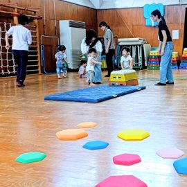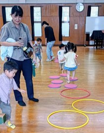 そのあとは愛真ホールへ移動して、平均台やとび箱、フープなどを